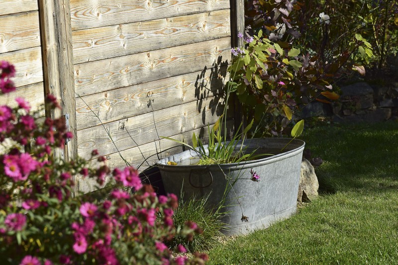 I drobná vodní plocha – tůňka nebo alespoň miska s kameny – pomůže obojživelníkům, vážkám a dalším živočichům. V přírodních zahradách plní roli nejen estetickou, ale i ekologickou. Málokomu totiž protéká skrz zahradu potok, nebo má za domem rybník…tak je dobré myslet i na vodní prvek. Nezapomeňte tam opět udělat dobrý výlez pro všechny živočichy. Stačí klidně zahloubit starou vanu, nebo plechovou nádobu/hrnec, nebo starý kýbl. Ideální je umístit takovou tůňku do polostínu, stínu, aby to nebyla pouze líheň komárů. Já u nás osadila starý kýbl kosatci žlutými a vachtou trojlistou, které jsem dostala, a tůňka si sama žije vlastním životem. Je dobré občas rostliny usměrnit, některé vytrhat, aby byla stále patrná i vodní plocha.