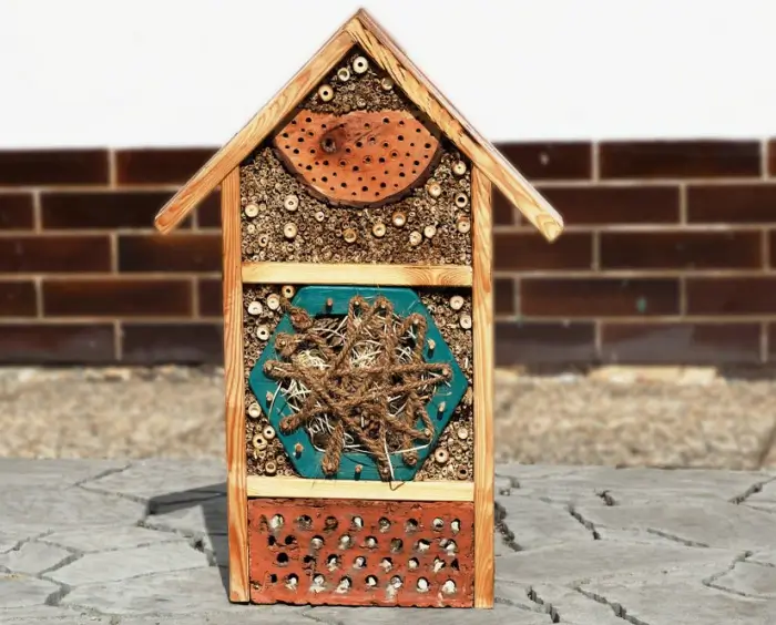 Pro včely samotářky, slunéčka sedmitečná či zlatoočka jsou hmyzí hotely ideálním útočištěm. Umístit je můžete na slunné místo, chráněné před deštěm. Kombinujte různé materiály – duté stonky, šišky, kousky dřeva s navrtanými otvory nebo slámu. Dají se koupit i hotové hmyzí hotely. Však je asi mnozí už na zahradě máte, a tak dobře víte, že to není jen změť 'zahradního odpadu', ale krásný designový detail.